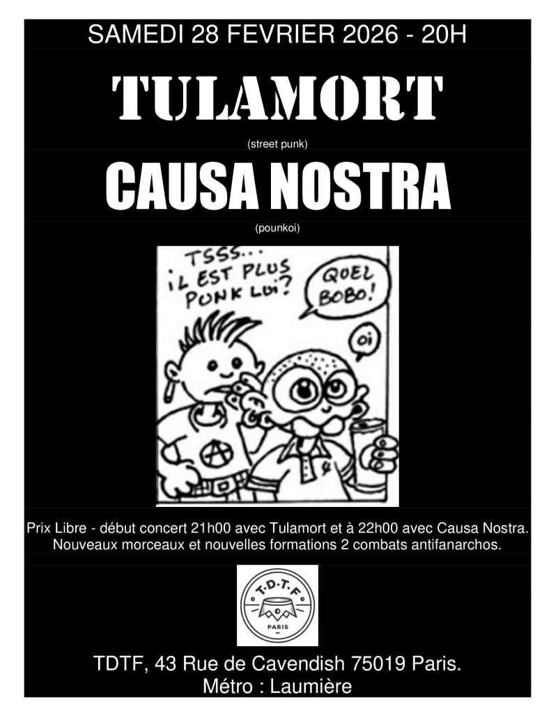 Prix libre. Début du concert à 21h avec Tulamort suivi de Causa Nostra à 22h. Nouveaux morceaux et nouvelles formations 2 combats antifanarchos.
